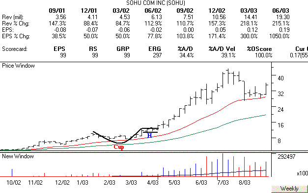 Meanwhile SOHU (SOHU) has been one of the leaders in the Internet-Services sector as it has done very well stock price wise over the past year.   As you can see below SOHU broke out of a favorable Cup and Handle (H) pattern in April of 2003 accompanied by strong volume and gained over 270% from April through July of 2003.