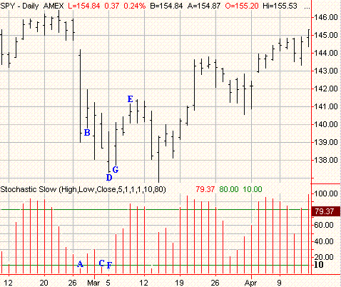 Furthermore the 5 Day Stochastic closed below 10 on 3/5/07 as well (point F)
